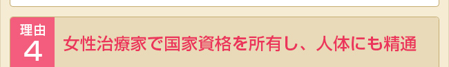 もちろん私は厚生労働省認可の国家資格を有しておりますので安心して整体治療を受けて頂くことができると思います。また女性治療家でありますので女性患者様特有の症状に対してもしっかり応対することができます。
