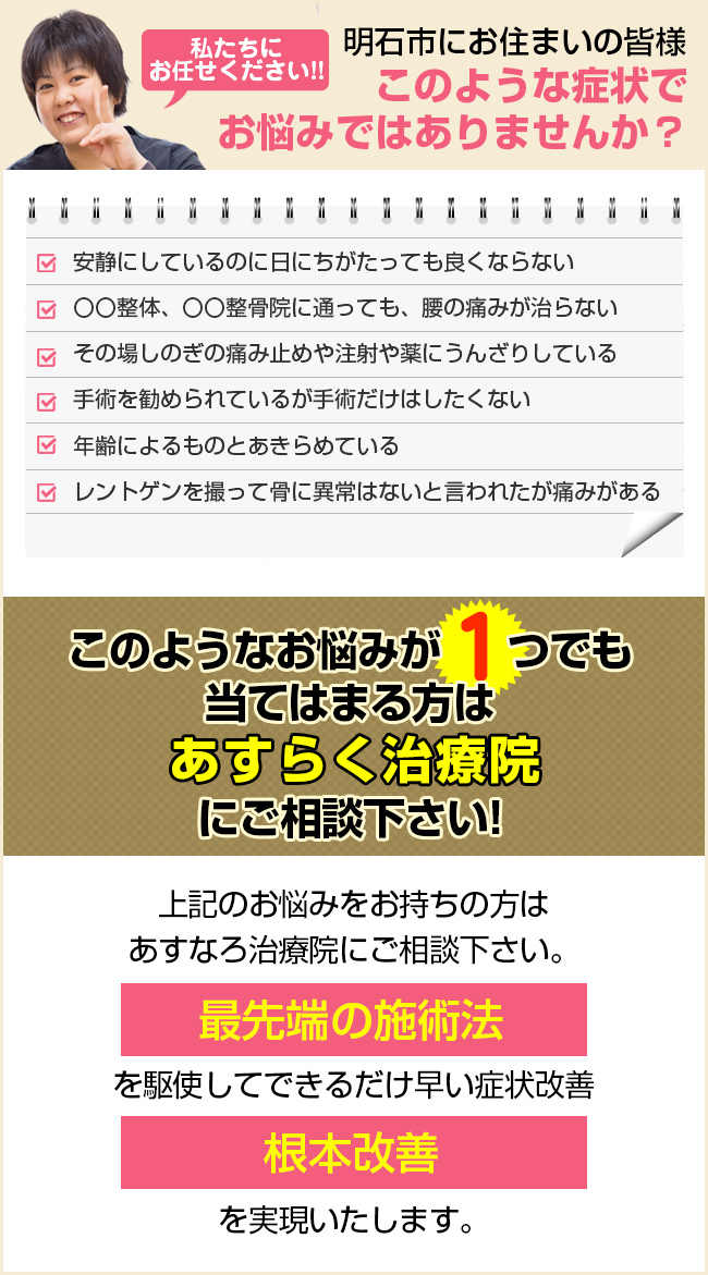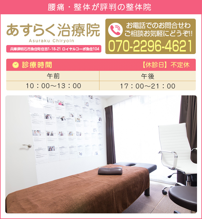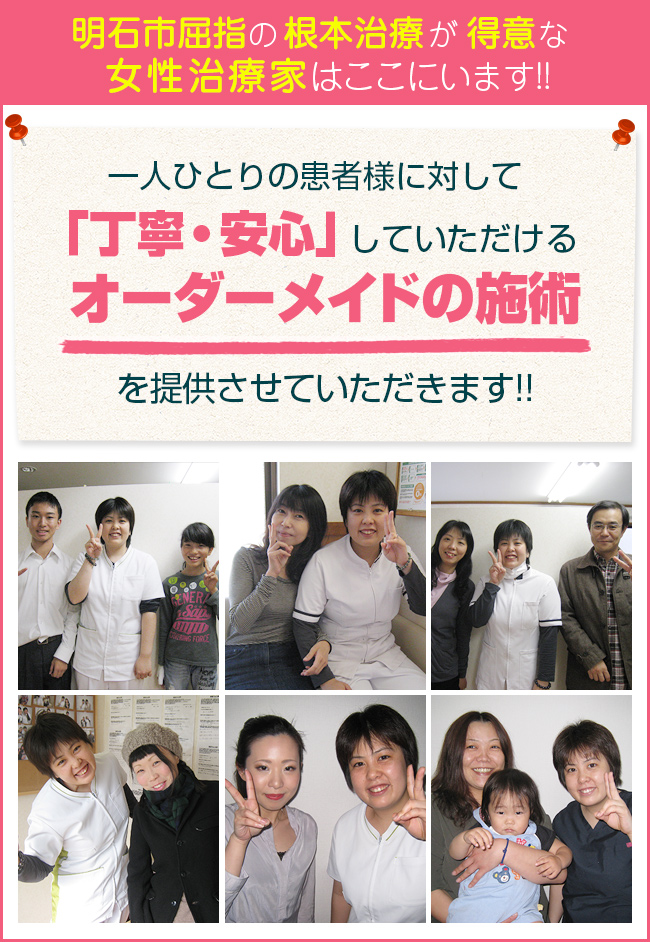 明石市にも病院や整形外科、整骨院や整体院など様々な医療機関がありますが、明石市で一番女性患者様に愛される整体院になれるよう全力でサポートをさせて頂きます。